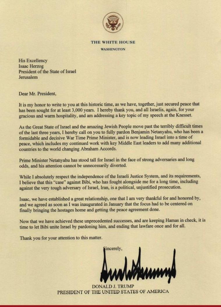 Trump writes a Letter to the Israeli Government begging them to pardon Bibi Netanyahu